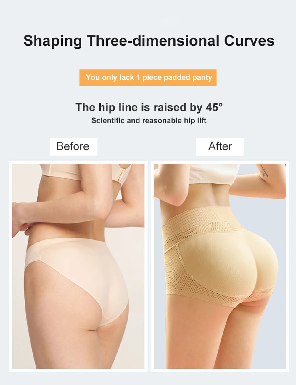 8.?Design Principle?These butt lifting panties will not enchance your butt, it is more like creating its own butt and lift your hipline. It's hard for people to notice that you're wearing butt lifting panties when your outfits cover your hips.The thickness of the hip pads also make your buttocks look very natural.